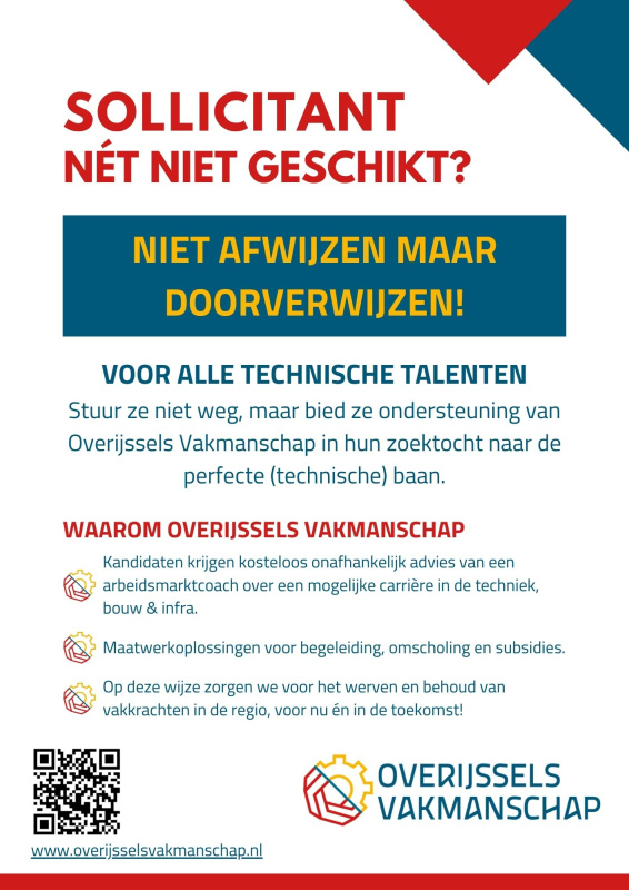 🚫 Niet afwijzen, maar doorverwijzen! 🚀 Heb je een kandidaat die niet helemaal aansluit bij jouw bedrijf, maar wel interessant is voor de technische sector? Verwijs ze door naar Overijssels Vakmanschap!