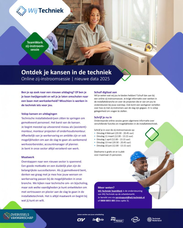 Ontdek wat werken in de techniek jou kan bieden tijdens de online zij-instroomsessie ‘Ontdek je kansen in de techniek!’. Je krijgt: